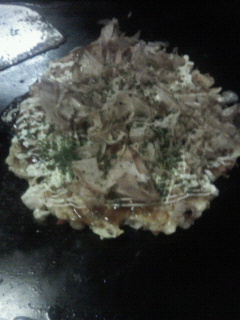 まず鉄板に油をひく。へらで薄く延ばした上で、ボールの中にある具を鉄板の上に落とす。具をへらで細かく砕きながら焼く。細かく砕き終わったらそれをまとめ、中央に穴をうがち、ドーナッツ状に整形。中央部に具に隠されていた水分(おそらく小麦粉を水で溶いたもの)に醤油で味付けした後、流し込んでいく。