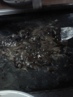 もはや岩の塊を寄せ集めて荒川を治水するような感じである。水分を流し込むとそのまま鉄板表面外部へ流水が開始される。もはや先に教わったもんじゃ作成手順の遵守は不可能な事態である。流失をへらで受け止め、何とかそれらしくなったのが下の画像だ。